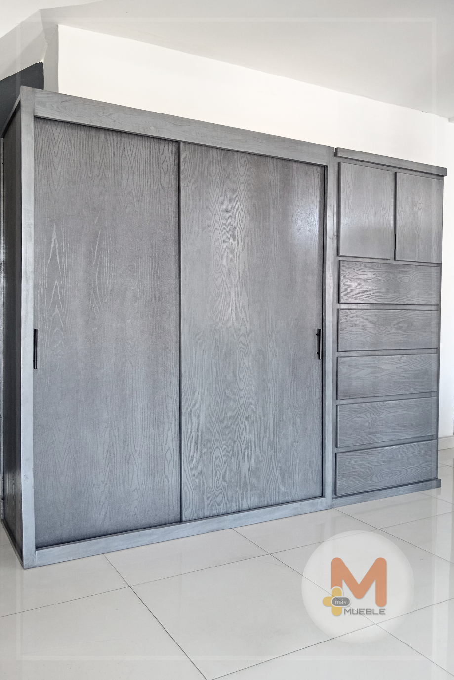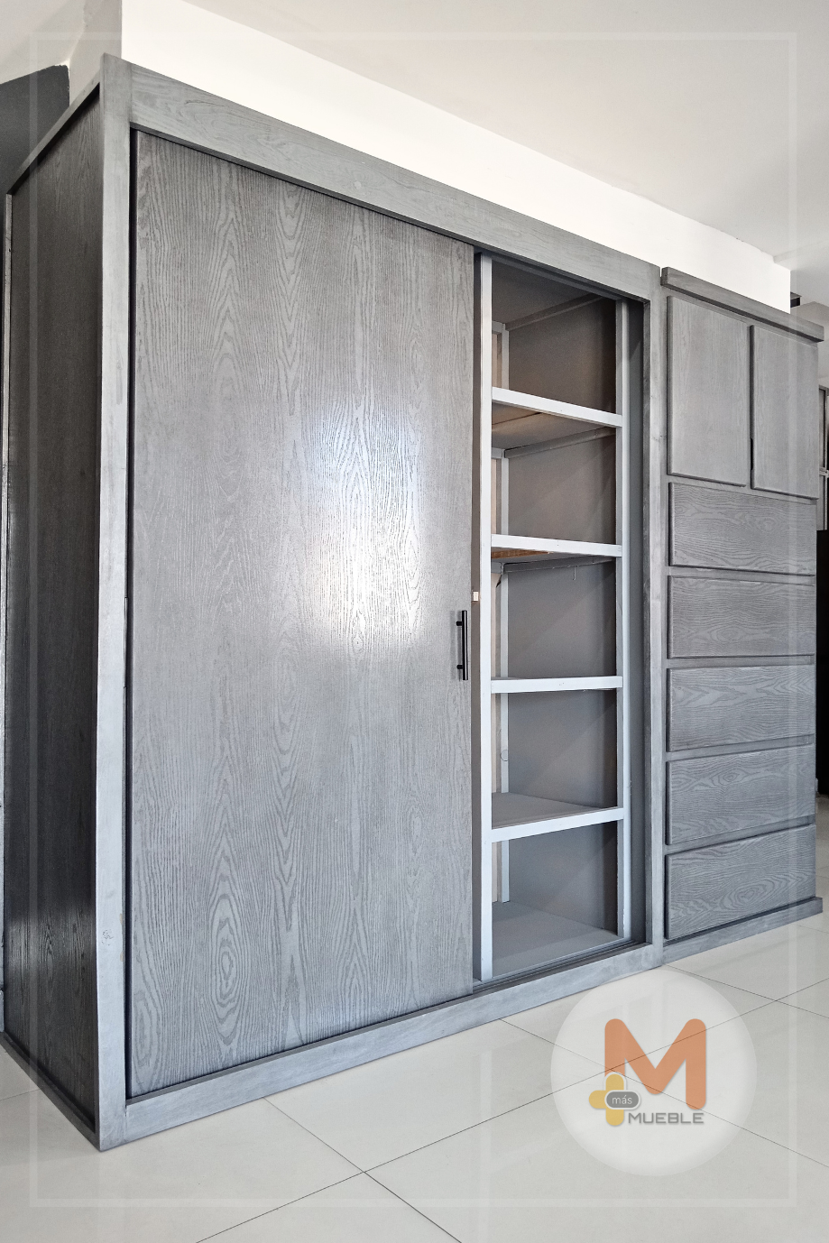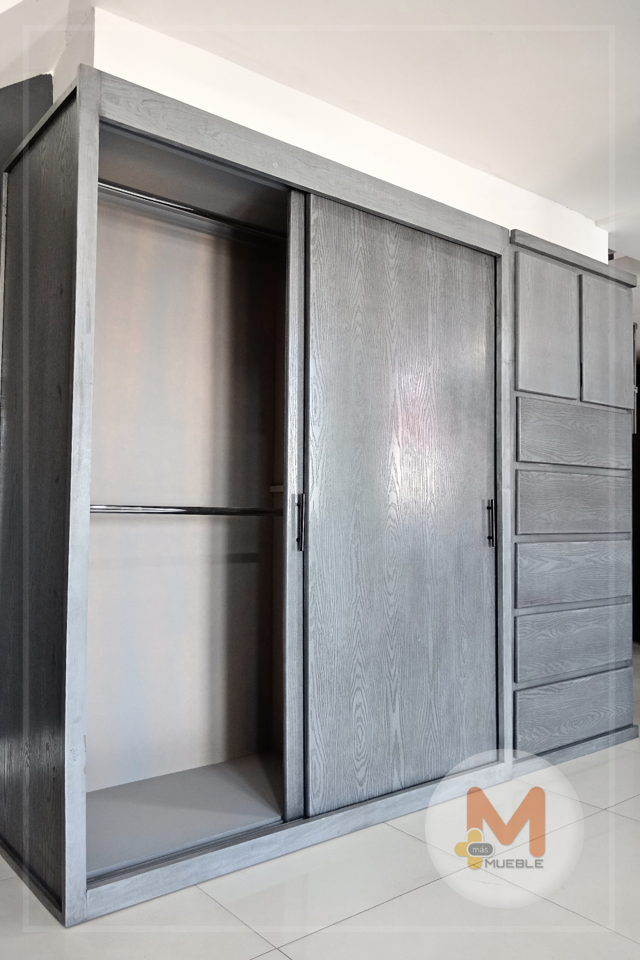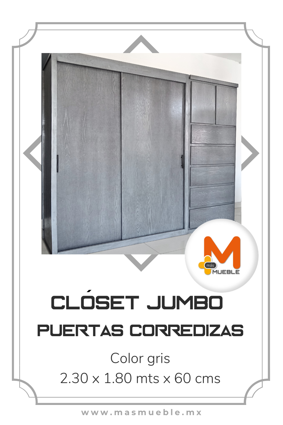 Clóset Jumbo puertas corredizas grisFabricado en su estructura con madera de pino maciza, MDF con acabado grabado en exteriores, MDF natural en interiores.