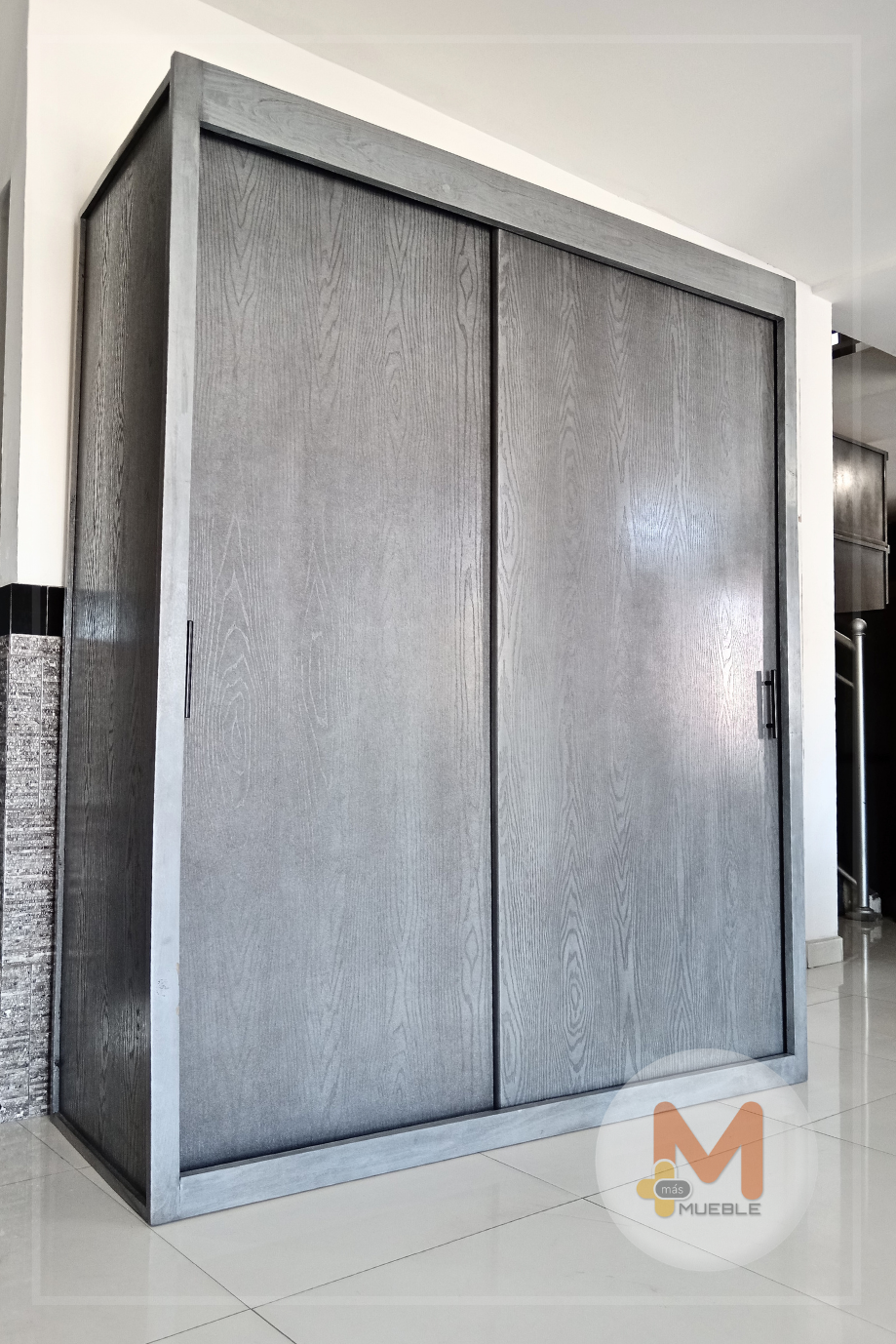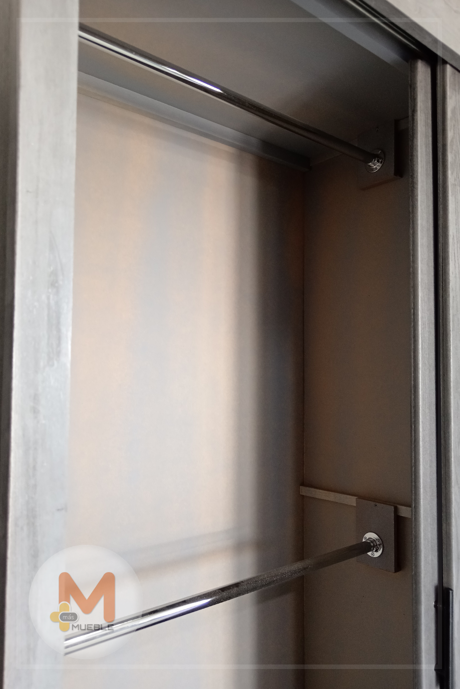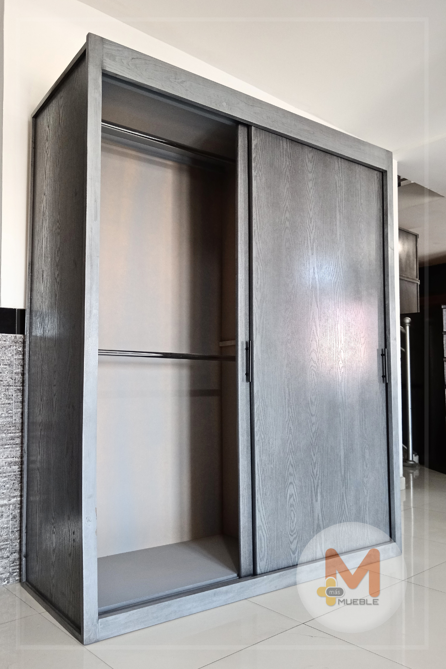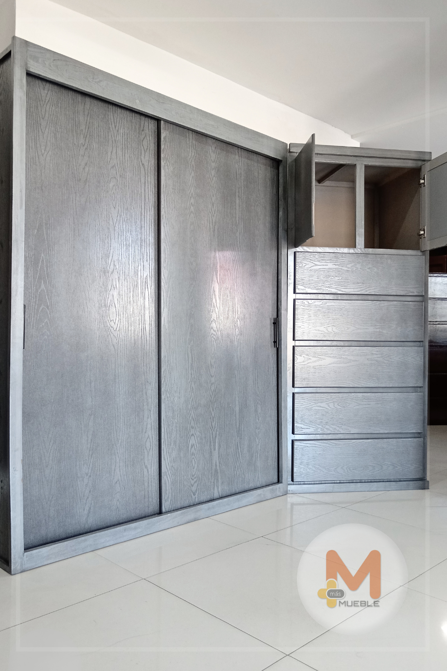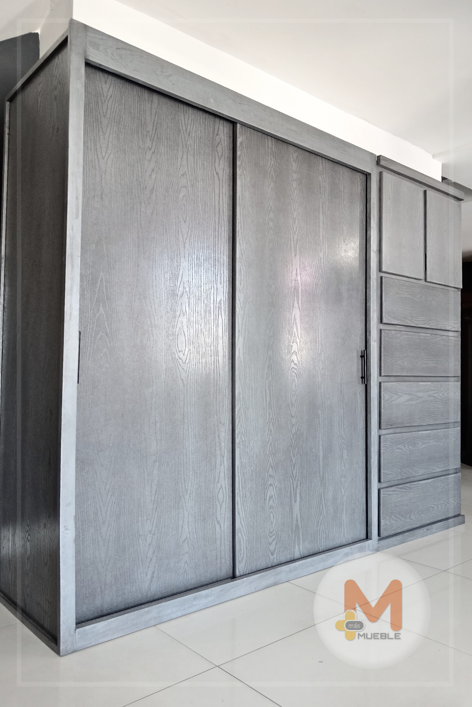 Clóset Jumbo puertas corredizas grisFabricado en su estructura con madera de pino maciza, MDF con acabado grabado en exteriores, MDF natural en interiores.