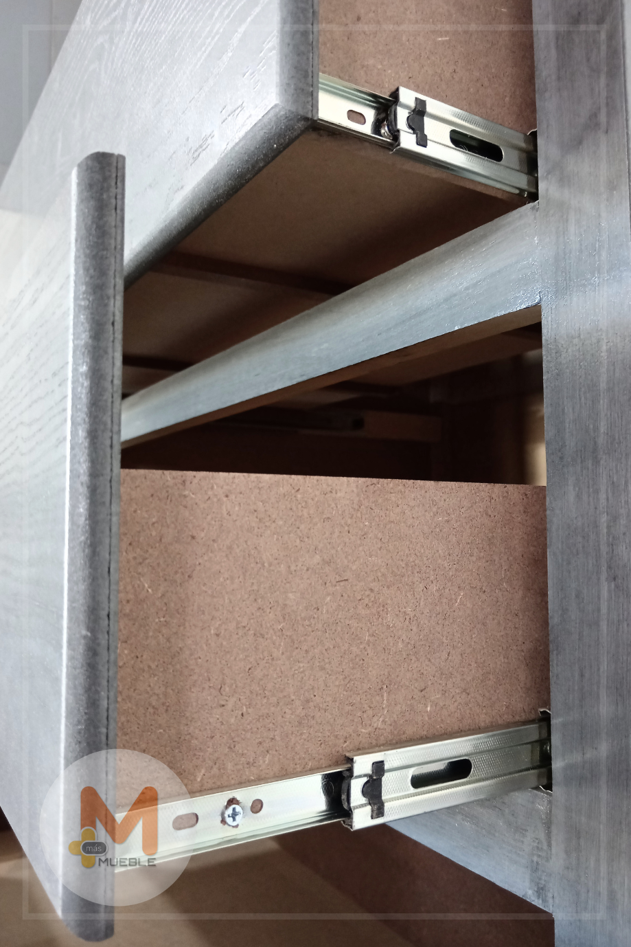 Bisagra oculta y rebaje detrás de los cajones y puertas para poder abrirlos fácilmente.