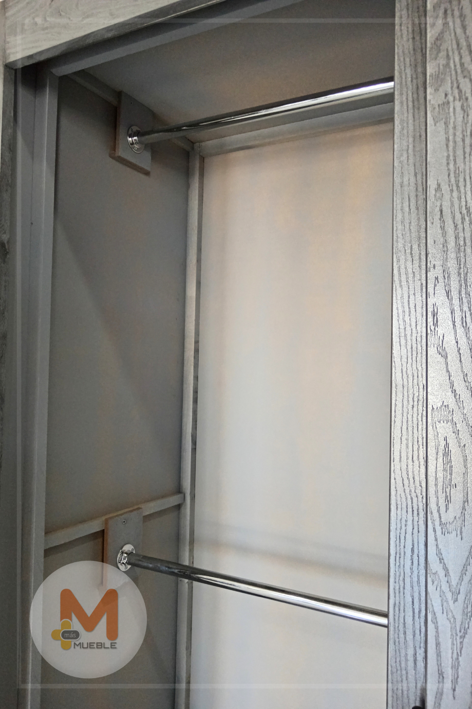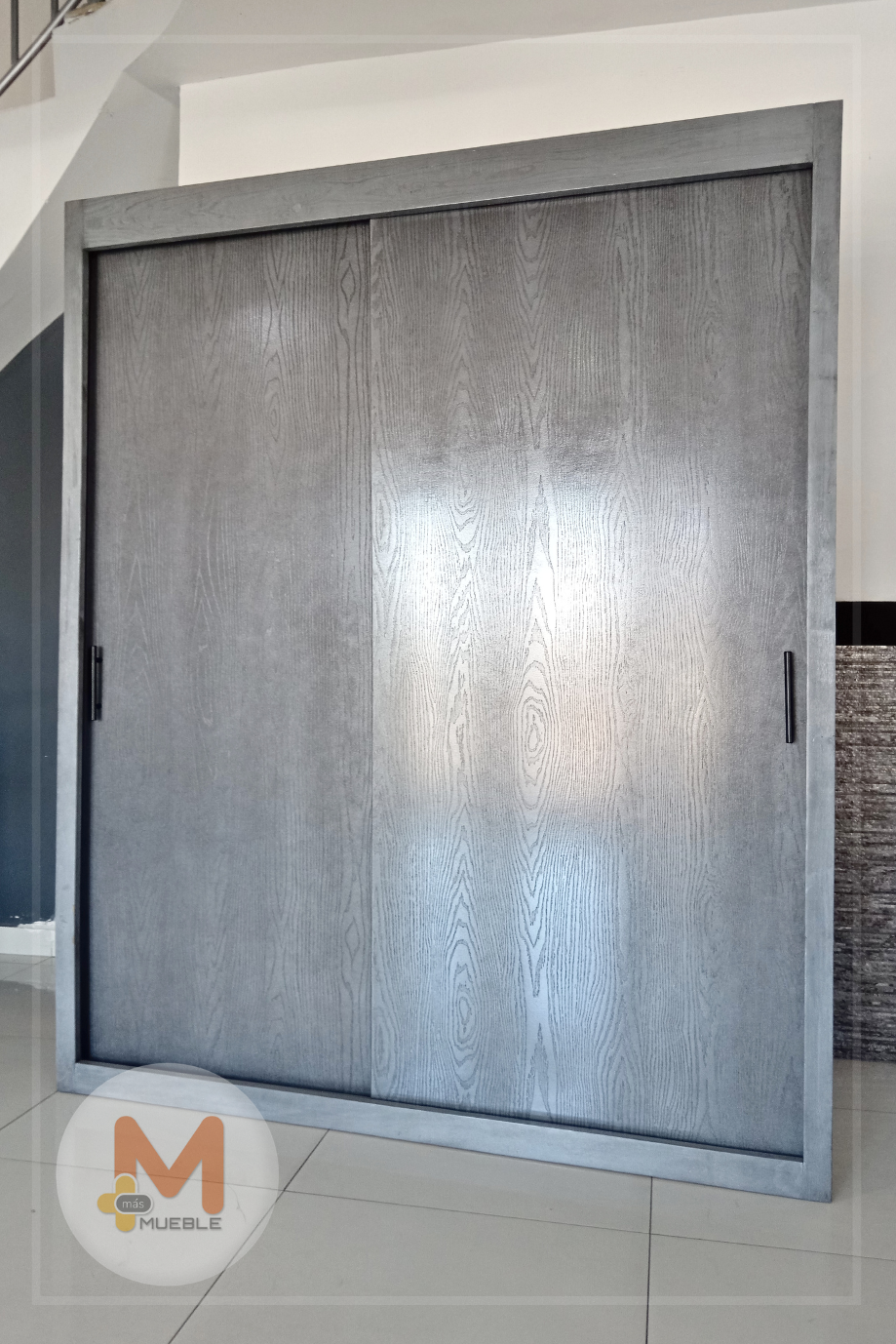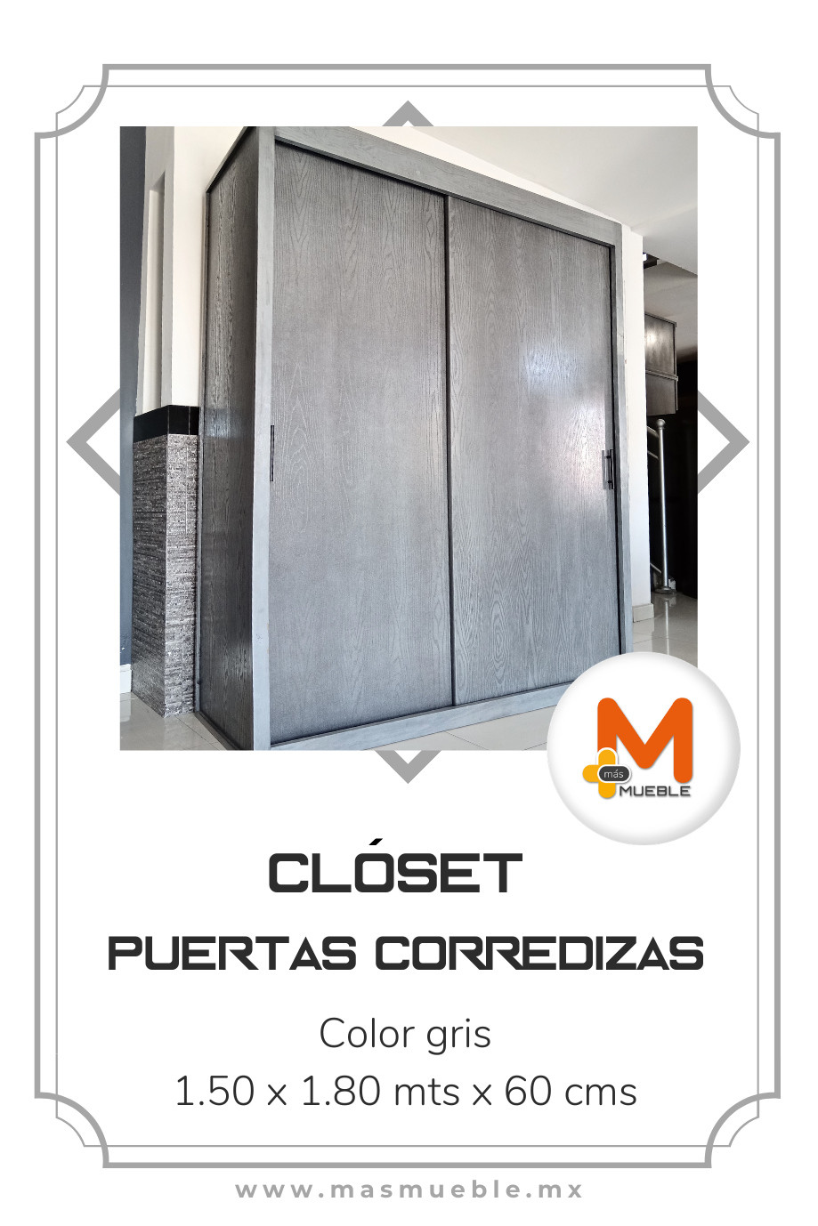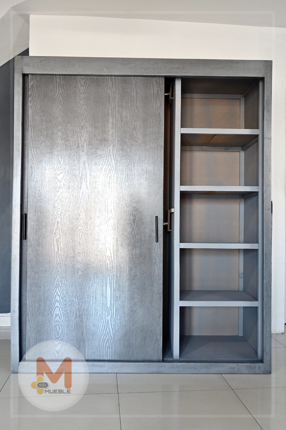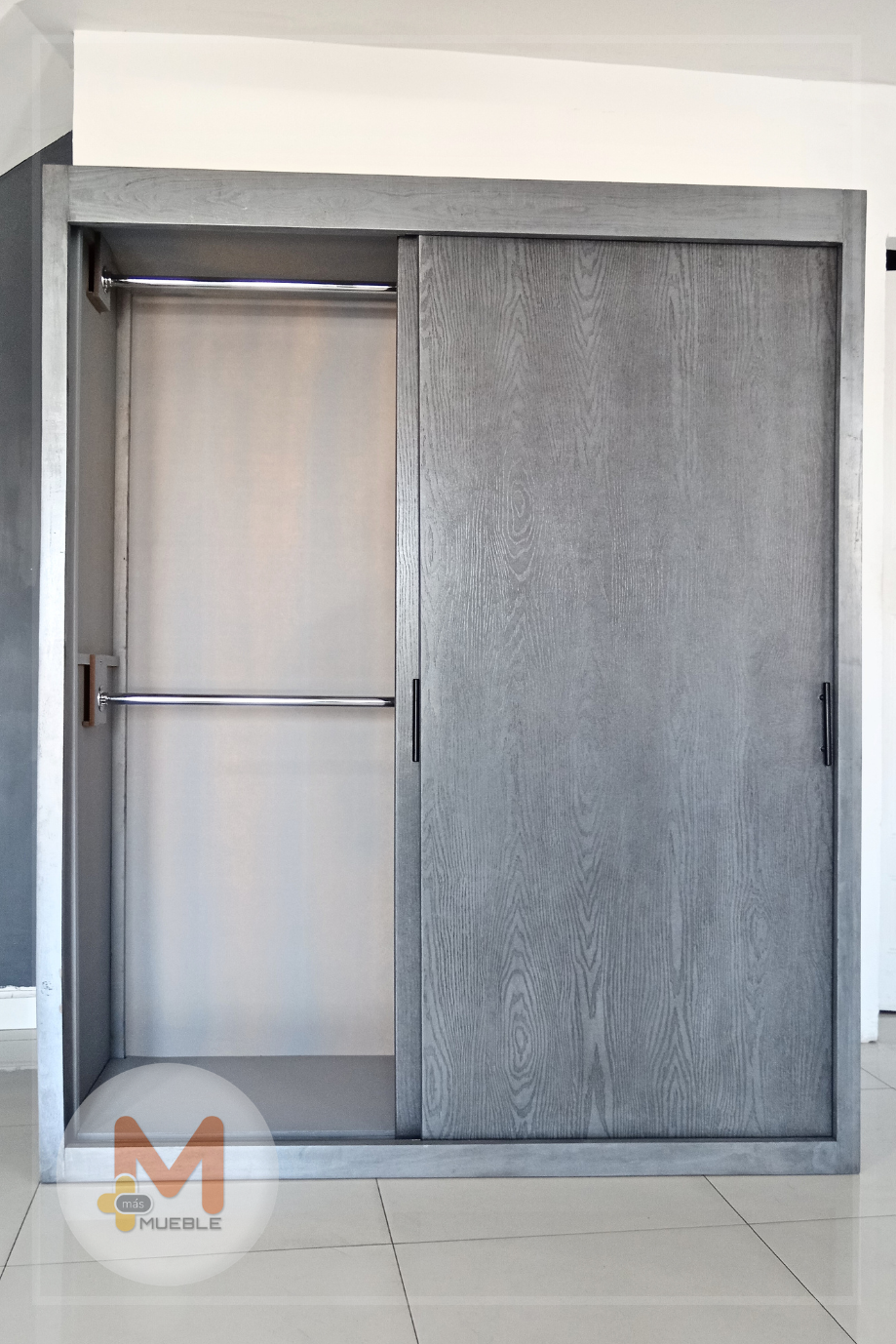 Clóset puertas corredizas grisFabricado en su estructura con madera de pino maciza, MDF con acabado grabado en exteriores, MDF natural en interiores.