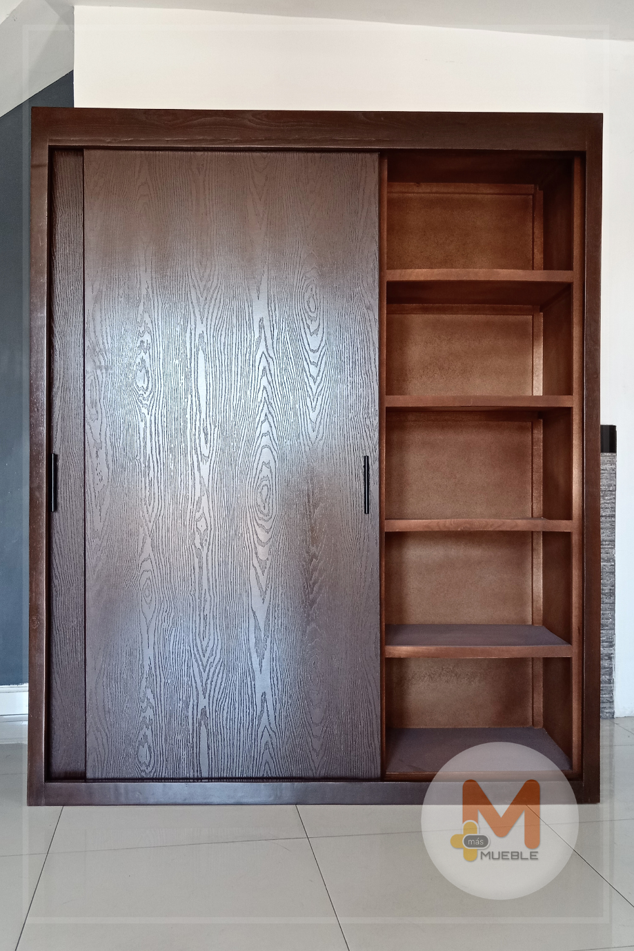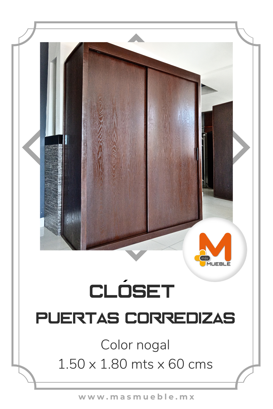Clóset puertas corredizas nogalFabricado en su estructura con madera de pino maciza, MDF con acabado grabado en exteriores, MDF natural en interiores.