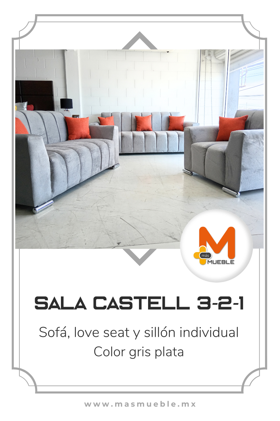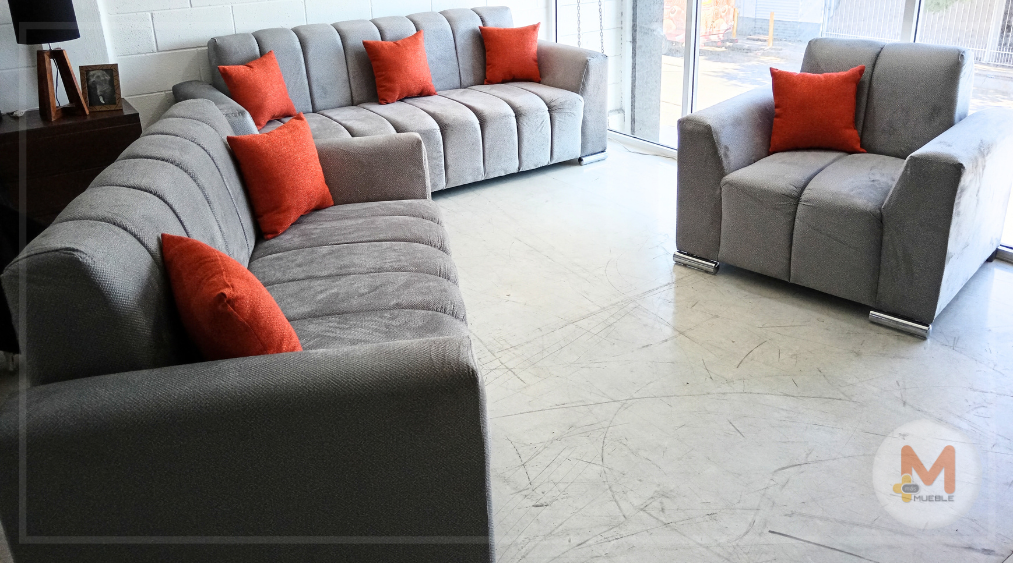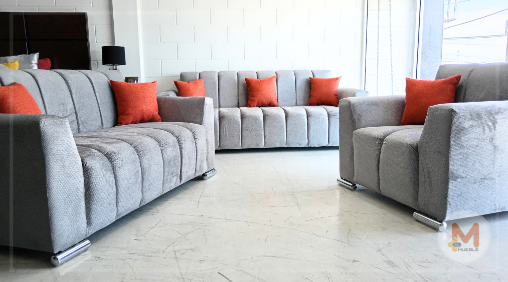 Sala Castell plata 3-2-1Fabricada en su estructura de madera de pino, telas nacionales y espumas americanas y nacionales de excelente calidad, garantizando firmeza duradera.