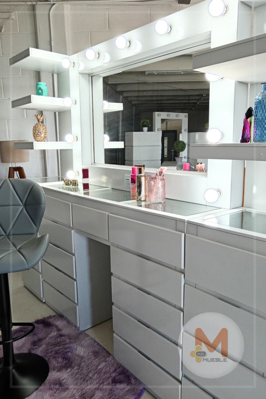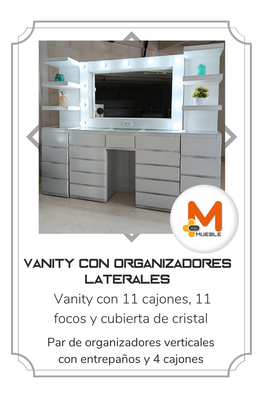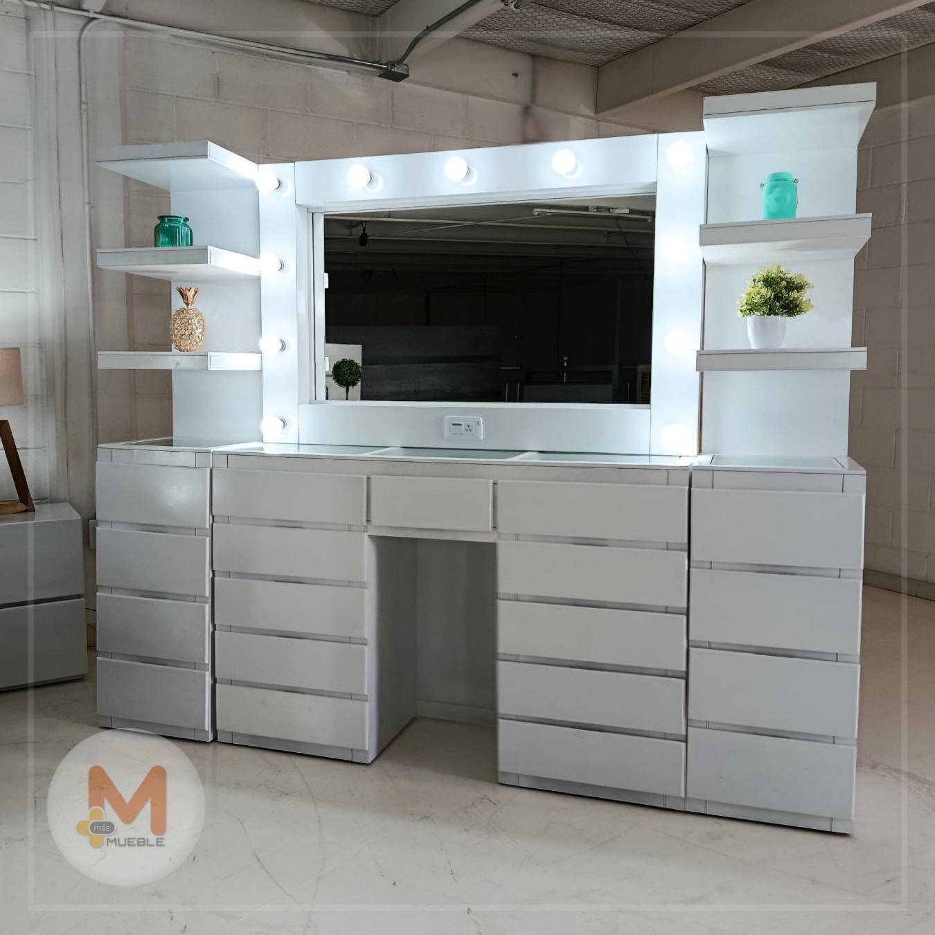 Vanity grande blanco con organizadores lateralesTocador Vanity con 11 cajones y luna iluminada con 11 focos LED (incluidos).