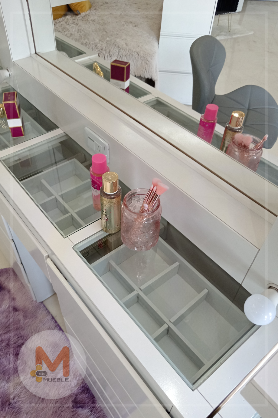 Cubiertas de cristal y organizadores en los cajones superiores del vanity.